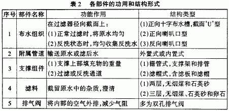 表2(見下頁(yè))所示為各部件的功用和結(jié)構(gòu)形式。濾料的選擇依據(jù):(1)濾料必須有足夠的機(jī)械強(qiáng)度,以免在反沖洗過(guò)程中很快地磨損和破碎;(2)濾料的化學(xué)穩(wěn)定性要好;(3)濾料不應(yīng)含有對(duì)人體健康有害及有毒物質(zhì),不應(yīng)含有對(duì)生產(chǎn)有害、影響生產(chǎn)的物質(zhì);(4)濾料的選擇,應(yīng)盡量采用吸附能力、截污能力大、產(chǎn)水量高、出水水質(zhì)好的濾料。其中的卵石,主要是起支撐作用,在過(guò)濾工藝過(guò)程中,因其強(qiáng)度高,相互之間的間距縫隙穩(wěn)定,即孔隙大,便于正洗工序中,濾后水順利通過(guò);反之,反洗工序中,反洗水和反洗空氣等順利通過(guò)。常規(guī)配置中,卵石分為四種規(guī)格,鋪墊方式,先大后小。濾料的粒徑和裝填高度之間的關(guān)系:濾床的高度和濾料的平均粒徑的比值為800~1 ooo(設(shè)計(jì)規(guī)范)。濾料的粒徑的大小和過(guò)濾精度相關(guān)。