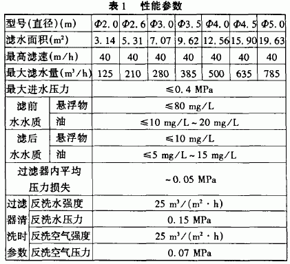 介質(zhì)過(guò)濾器,在工業(yè)循環(huán)水處理系統(tǒng)中,用以去除污水中雜質(zhì)、吸附油等,使水質(zhì)符合循環(huán)使用的要求。過(guò)濾的含義,在水處理過(guò)程中,過(guò)濾一般是指以石英砂、無(wú)煙煤等粒狀濾料層截留水中懸浮雜質(zhì),從而使水獲得澄清的工藝過(guò)程。過(guò)濾的作用,主要是去除水中的懸浮或膠態(tài)雜質(zhì),特別是能有效地去除沉淀技術(shù)不能去除的微小粒子和細(xì)菌等,BODs和COD等也有某種程度的去除效果。性能參數(shù)如表1所示: