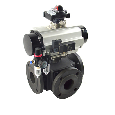 二段式氣動(dòng)三通球閥3個(gè)位置的氣動(dòng)三通球閥由三段式氣動(dòng)執(zhí)行器和三通球閥組成,利用2個(gè)換向電磁閥來(lái)控制閥門所要求的開(kāi)關(guān)位置上。氣動(dòng)執(zhí)行器可以實(shí)現(xiàn)0度,90度,180度三個(gè)位置,屬于非標(biāo)產(chǎn)品。