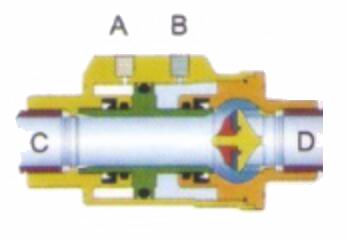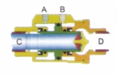 當(dāng)A孔進(jìn)氣(B 孔排氣)時(shí),活塞向D口移動(dòng)并壓在閥座密封上,此時(shí)閥門關(guān)閉。單動(dòng)常閉型的彈簧安裝在A端腔室。在非控制時(shí),活塞是壓在閥座上。所以其最常用的是關(guān)閉位。