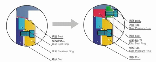 3.偏心三,閥體中心線與閥座圓錐密封面中心線偏離一定角度,使閥門開啟或關閉時蝶板密封環(huán)與閥座之間迅速脫離或接觸,密封副之間無摩擦、無卡擠