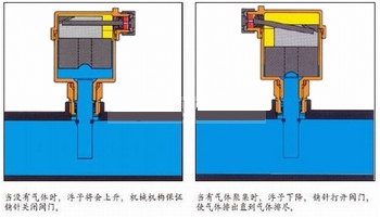 當(dāng)系統(tǒng)中有空氣時(shí),氣體聚集在排氣閥的上部,體內(nèi)氣泡堆積使浮球隨水位下降,因此打開排氣活塞;氣體排盡后,水位上升,浮球也隨之上升,關(guān)閉排氣活塞。如擰緊閥體側(cè)部的閥帽,自動(dòng)排氣閥停止排氣,在通常,閥帽應(yīng)該處于開啟狀態(tài)。
