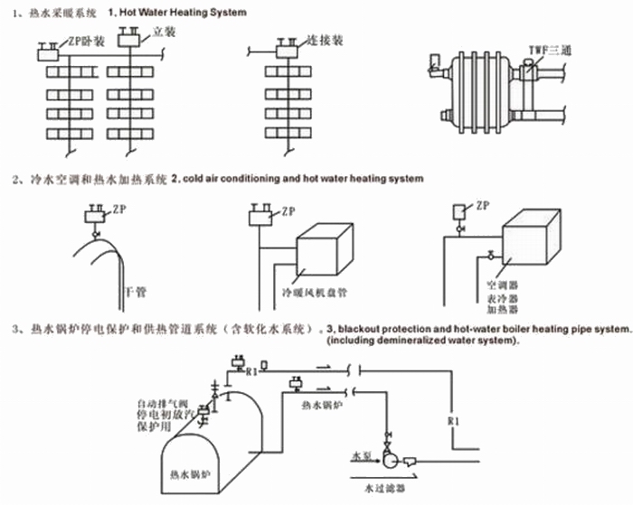 自動(dòng)排氣閥用于獨(dú)立采暖系統(tǒng),集中供熱系統(tǒng),地板輻射采暖系統(tǒng),太陽能采暖系統(tǒng),熱泵系統(tǒng),中央空調(diào),采暖鍋爐等。