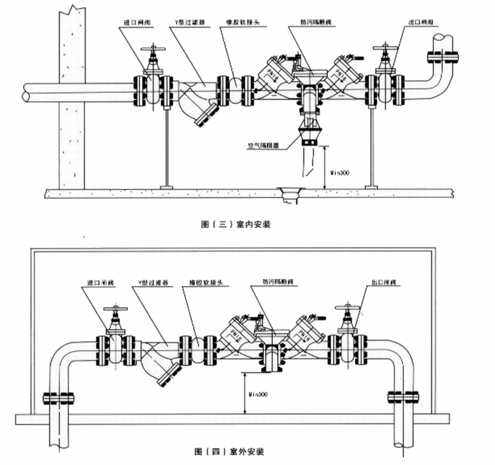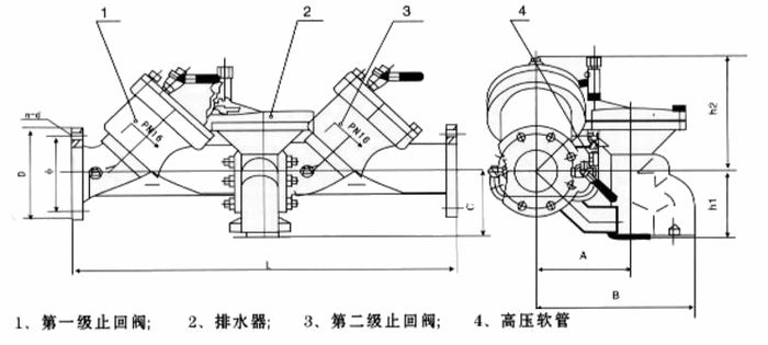 2.安全型倒流防止器是在兩個止回閥之間加一個排水器組成。(分為法蘭和螺紋連接)
